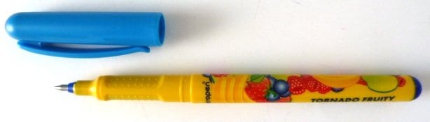 CENTROPEN TORNADO FRUITY 2675 Školský roller, ERGO držanie s masážnymi bodmi, pre pravákov, ľavákov i dysgrafikov. Modrý zmizíkovateľný parfumovaný atrament (banán, jablko, jahoda, malina, čučoriedka). Šírka stopy 0,3 mm, hrot guľôčkový roller o 0,5 mm.