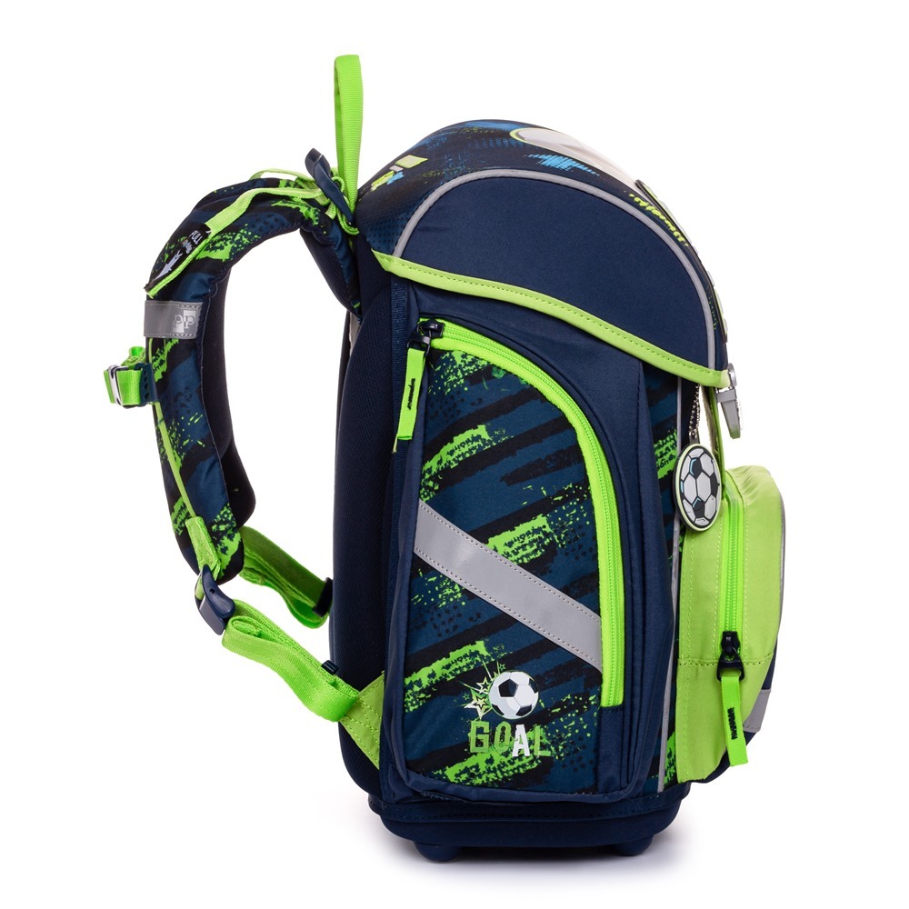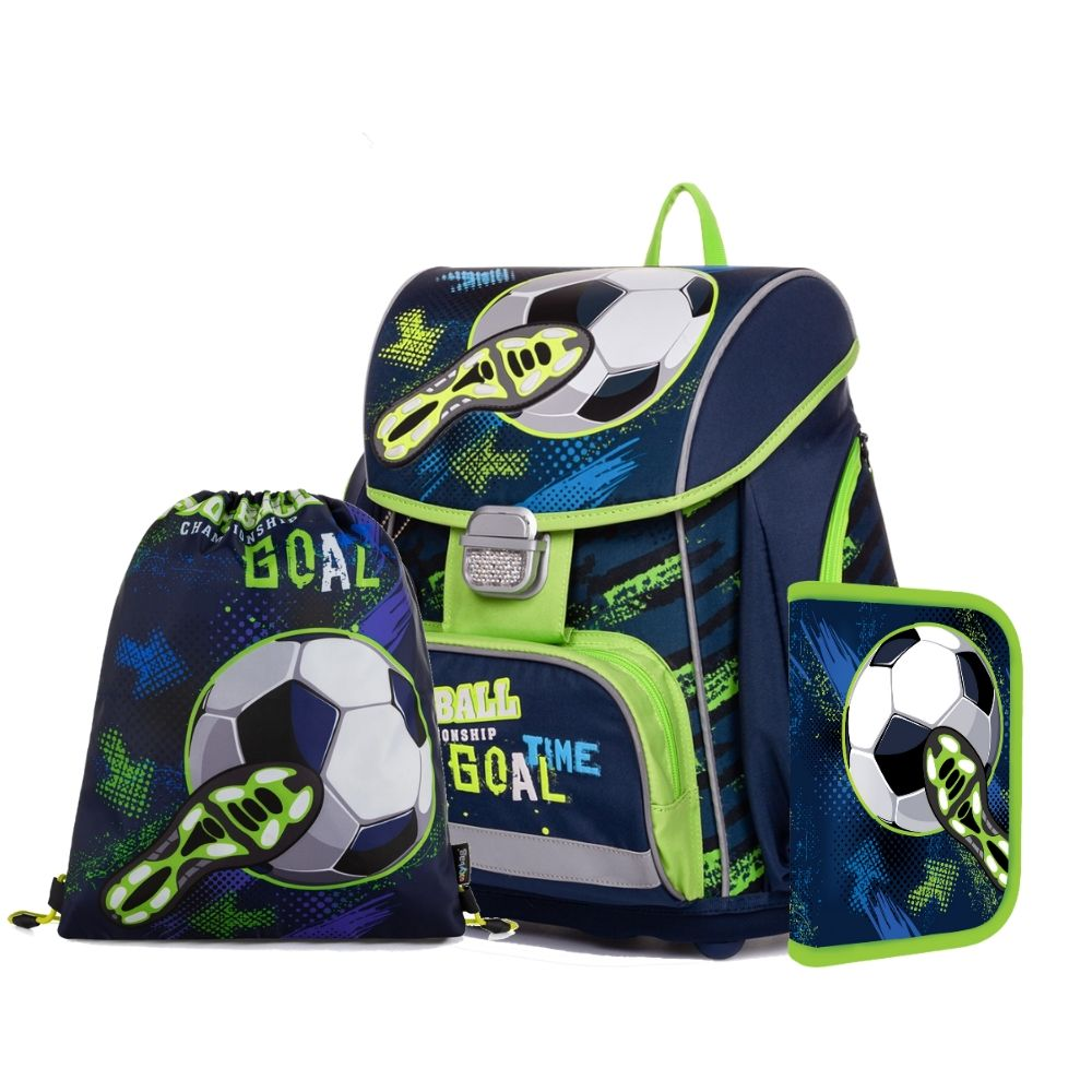 Školský set pre prváčika s motívom futbalu. Set obsahuje školský batoh Premium, vrecko na cvičky a nenaplnený jednoposchodový peračník.