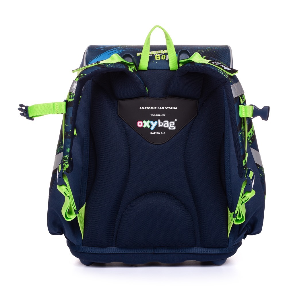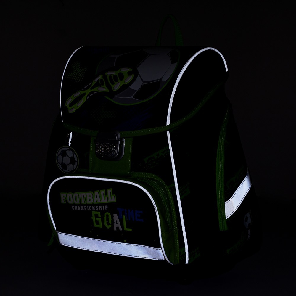 Aktovka: Školská aktovka z rady Premium s motívom futbalu je anatomicky tvarovaná a zaisťuje tak správne usadenie na chrbte. Vystužený chrbát a vnútorná výstuha udržujú stály tvar batohu. Polstrovanie je z príjemného priedušného materiálu, široké mäkčené popruhy sú navrhnuté tak, aby dokonale priľnuli a rovnomerne zaťažili plecia dieťaťa. Aktovka pozostáva z jednej priestrannej komory, kam sa pohodlne zmestia všetky školské pomôcky pre deti v 1. a v 2. triede. Dno batohu je z pevného materiálu, chráni tým obsah pred prevrhnutím a vysypaním. Zapínanie je na bezpečnostné pracku. Predné vrecko je určená na desiatu, nechýba rad reflexných prvkov, vďaka ktorým je aktovka viditeľnejšie.